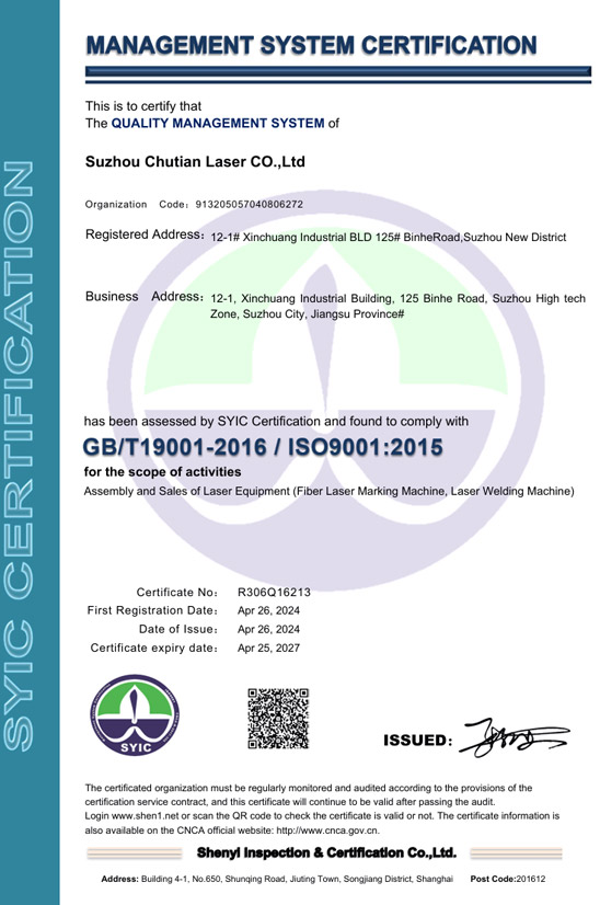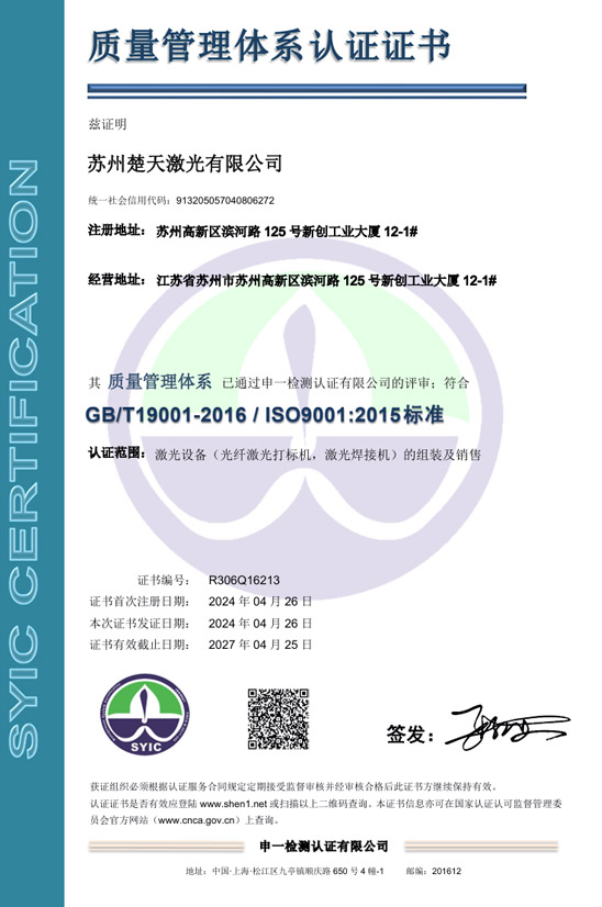 楚天激光在激光行業(yè)率先通過ISO9000質(zhì)量認(rèn)證體系。擁有超過萬臺(tái)激光設(shè)備運(yùn)用典范。